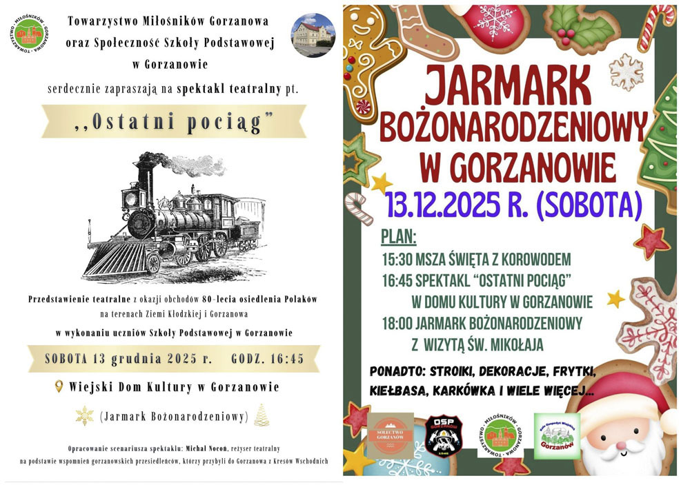 Zapraszamy do Gorzanowa 13 grudnia - godz. 15.30-18.00. A o godz. 16.45 odbędzie się spektakl pt. "Ostatni pociąg". Szczegóły na plakacie.